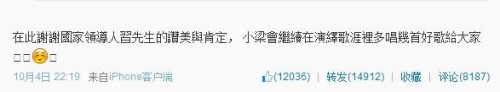 随后,梁静茹在微博上发文说,“在此谢谢国家领导人习先生的赞美与肯定,小梁会继续在演绎歌涯里多唱几首好歌给大家”。